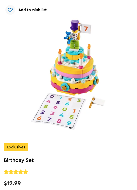 There are a few sets every year that are only available on Lego.com, and they are not just the whopper expensive ones. Others include seasonal decorations such as holiday wreathes, Harry Potter and other characters, and this super cute little birthday set!